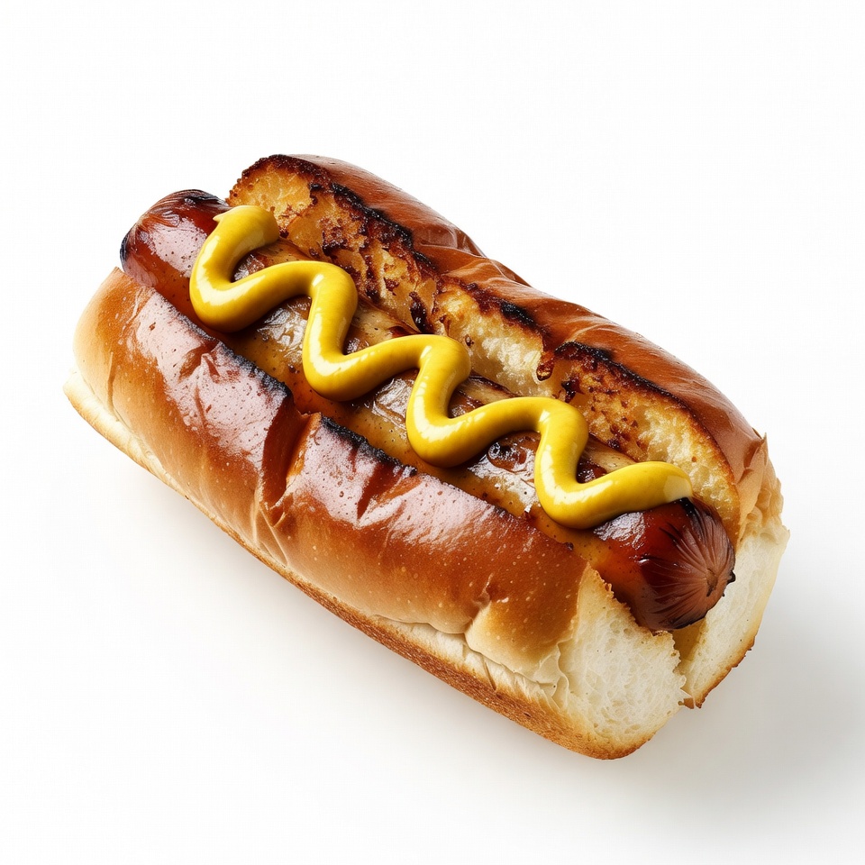 A grilled hot dog in a toasted bun topped with a thick zigzag of yellow mustard. The sausage is browned and shiny, placed on a plain white background. The bun has a crisp, golden crust with soft interior.