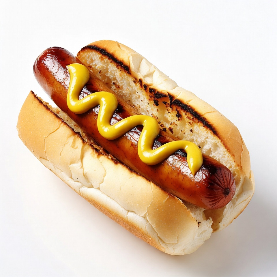 barbecue, bun, condiments, cookout, delicious, dinner, fast food, food, frankfurter, grilled, isolated background, ketchup absent, lunch, meal, mustard, onions absent, relish absent, sausage, snack, street food, wiener, yellow mustard, hot dog