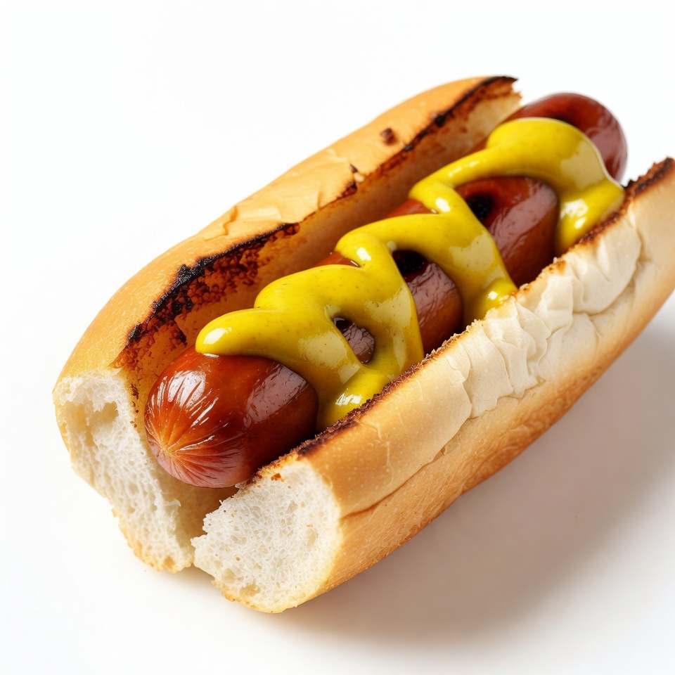 A grilled hot dog in a white bun is topped with thick yellow mustard. The sausages are browned with grill marks, and the bun is slightly toasted. The food is isolated on a white background.