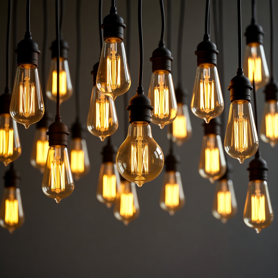 Edison bulbs, black cords, bulb arrangement, bulb cluster, dark background, decorative lighting, filament bulbs, glowing bulbs, hanging lights, industrial lights, interior lighting, lighting fixture, overhead lights, pendant lights, suspended bulbs, vintage bulbs, warm glow, warm lighting, yellow light, light bulbs