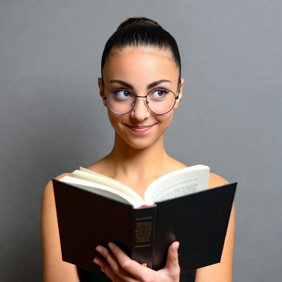 A young woman with dark hair in a bun and round glasses smiles while looking up from an open black book she holds with both hands. She has bare shoulders and stands against a plain gray background. Her expression is thoughtful and pleased.