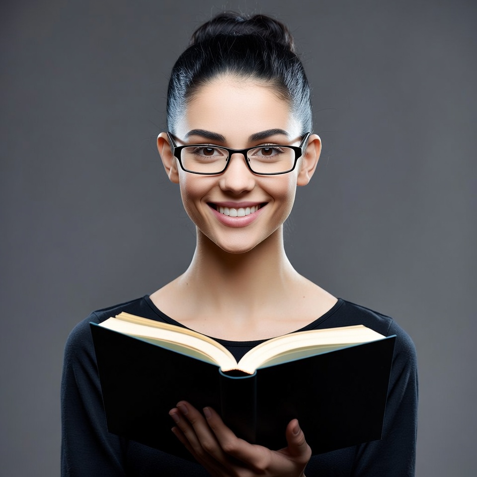 A young woman with dark hair in a bun and black-rimmed glasses smiles while holding an open book in front of her. She wears a black top and stands against a plain gray background. Her expression is happy and engaged with the book.
