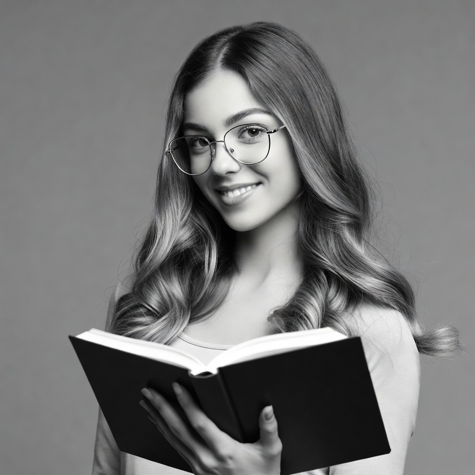 White, black and white, black book, book, book reader, female, glasses, gray background, happy woman, long hair, monochrome, open book, portrait, reading book, smiling, stylish glasses, wavy hair, young woman, woman