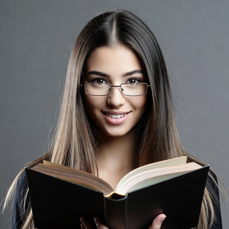 A young woman with long dark brown hair and glasses smiles while holding an open book in front of her. She has a friendly expression and is positioned against a plain gray background. The book is large and held at chest level.