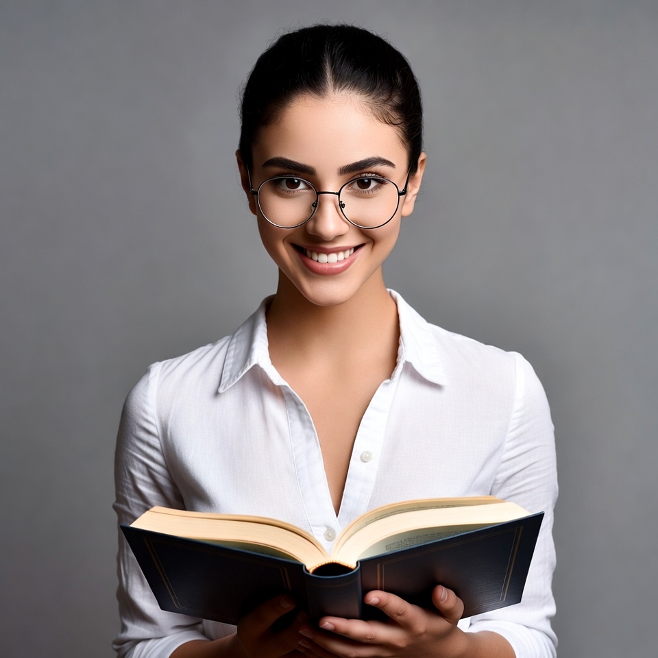 A young woman with dark hair in a bun and round glasses smiles while holding an open book in front of her. She wears a white collared shirt with the top buttons undone. The image features a plain gray background.