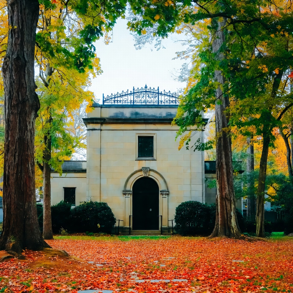 Stone Mausoleum Framed by Autumn Trees