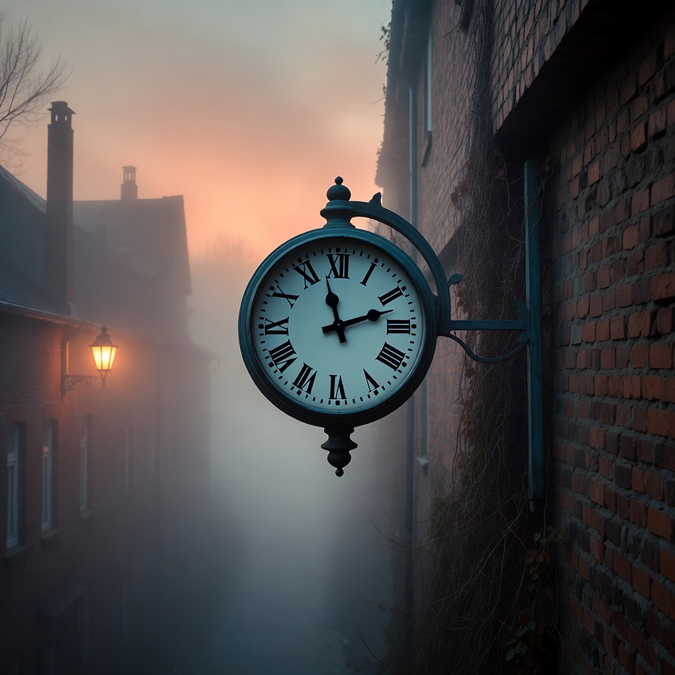 Roman numerals, architecture, atmospheric fog, bare trees, blue tones, brick wall, foggy alley, ivy, lantern, mist, narrow street, old building, red bricks, street lamp, sunset glow, twilight, urban scene, vintage clock, wall clock, clock