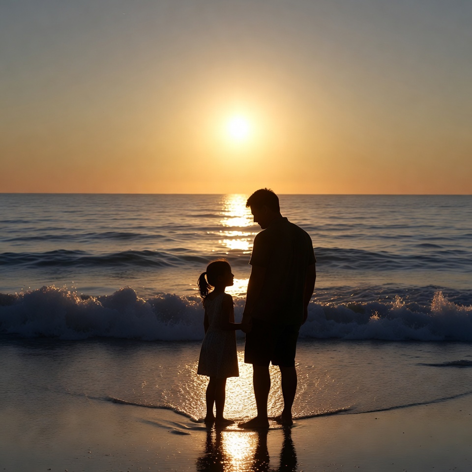 A silhouette of a father and young daughter stands on the beach facing the ocean during sunset. The bright orange sun glows above the horizon, reflecting on the waves. They hold hands with gentle waves lapping at their feet.