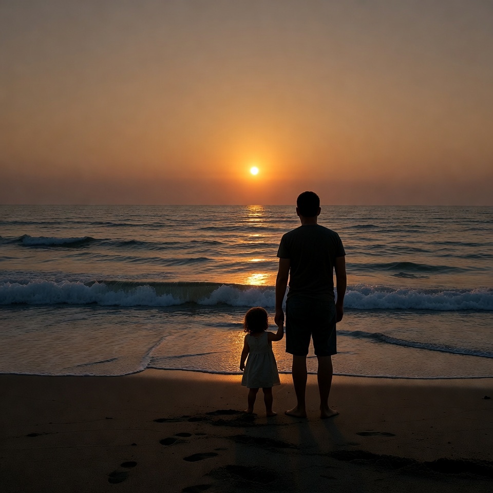 A silhouette of a father holding his young daughter's hand stands on the sandy beach at sunset. The sun glows orange over the ocean waves, casting reflections on the water. They face the sea with footprints visible in the sand behind them.