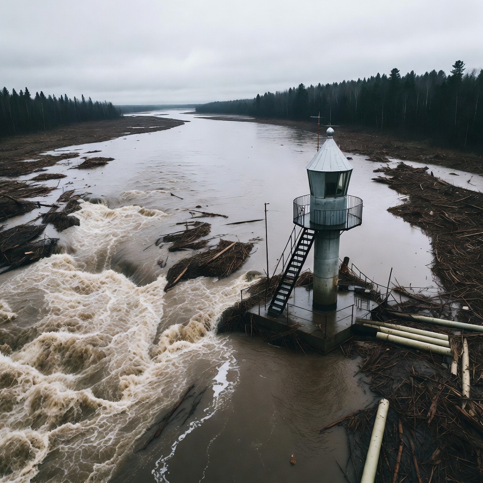 Lighthouse amid flooded river debris
