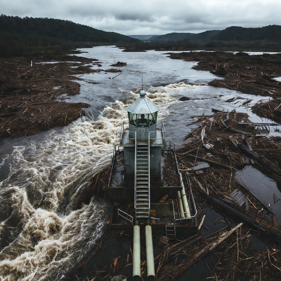 A small lighthouse structure stands on a platform in a turbulent, debris-filled river surrounded by forested mountains. Logs and wooden wreckage float around the base, with rushing water flowing beneath metal stairs and pipes. Cloudy skies loom over the dramatic flood scene.