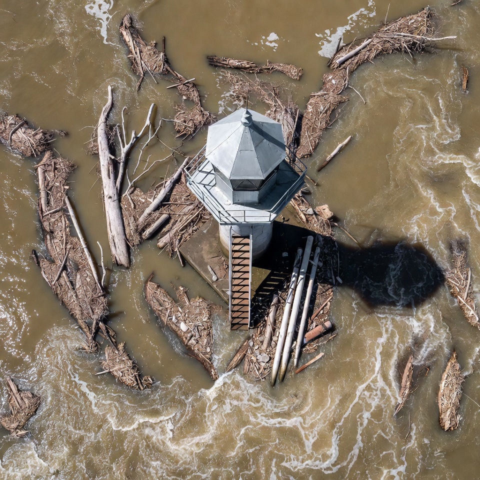 aerial view, branches, brown water, debris, disaster, driftwood, flood, flooded structure, flooding, floodwater, gray lighthouse, logs, metal railings, muddy water, natural disaster, octagonal lighthouse, overflow, overhead shot, river, staircase, submerged, water damage, wooden debris, wreckage, lighthouse