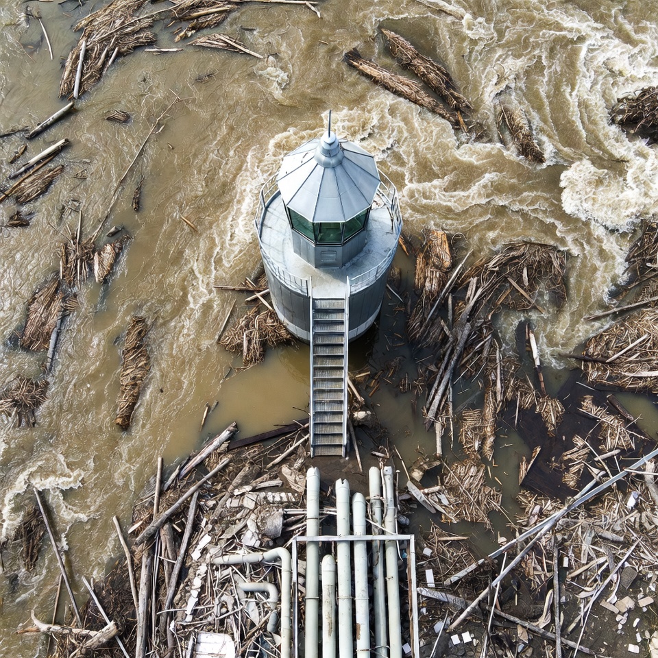 A small gray lighthouse with a green lantern and metal stairs stands surrounded by turbulent brown floodwaters filled with floating logs and debris. Metal pipes extend from the base into the water. The aerial view captures the structure isolated against the chaotic river current.