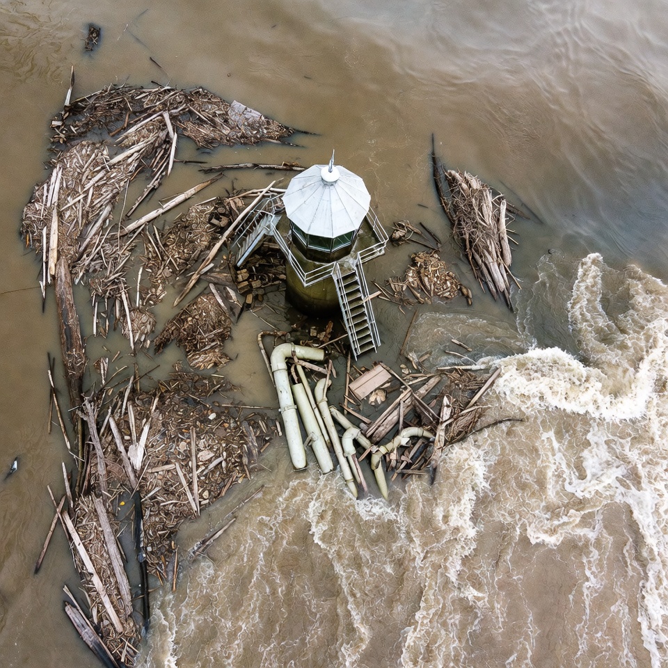 aerial view, brown water, conical roof, debris, disaster, floating debris, flood, flood damage, flooding, metal stairs, muddy water, overhead view, pipes, river flood, staircase, submerged structure, turbulent water, water, white lighthouse, wooden logs, wreckage, lighthouse