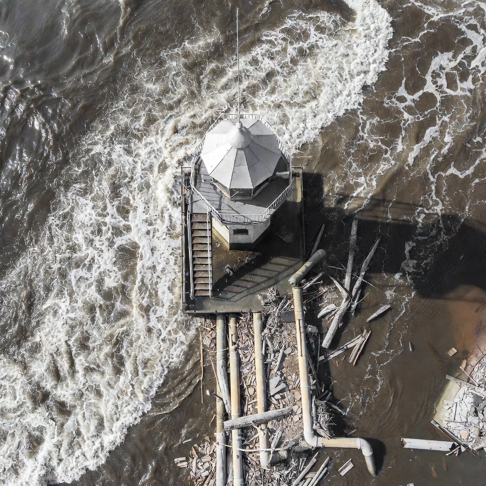 aerial view, beacon, brown waves, coastal structure, debris, isolated lighthouse, maritime, nautical, ocean, pipelines, platform, rough seas, sea, top-down view, turbulent water, waves, white lighthouse, wooden logs, wreckage, lighthouse