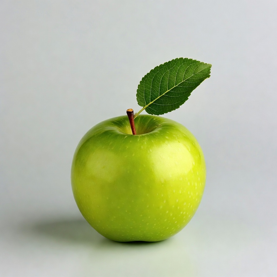 apple, fresh fruit, fruit, glossy apple, green leaf, healthy food, isolated background, leaf, nature, produce, ripe apple, single apple, stem, white background, green apple