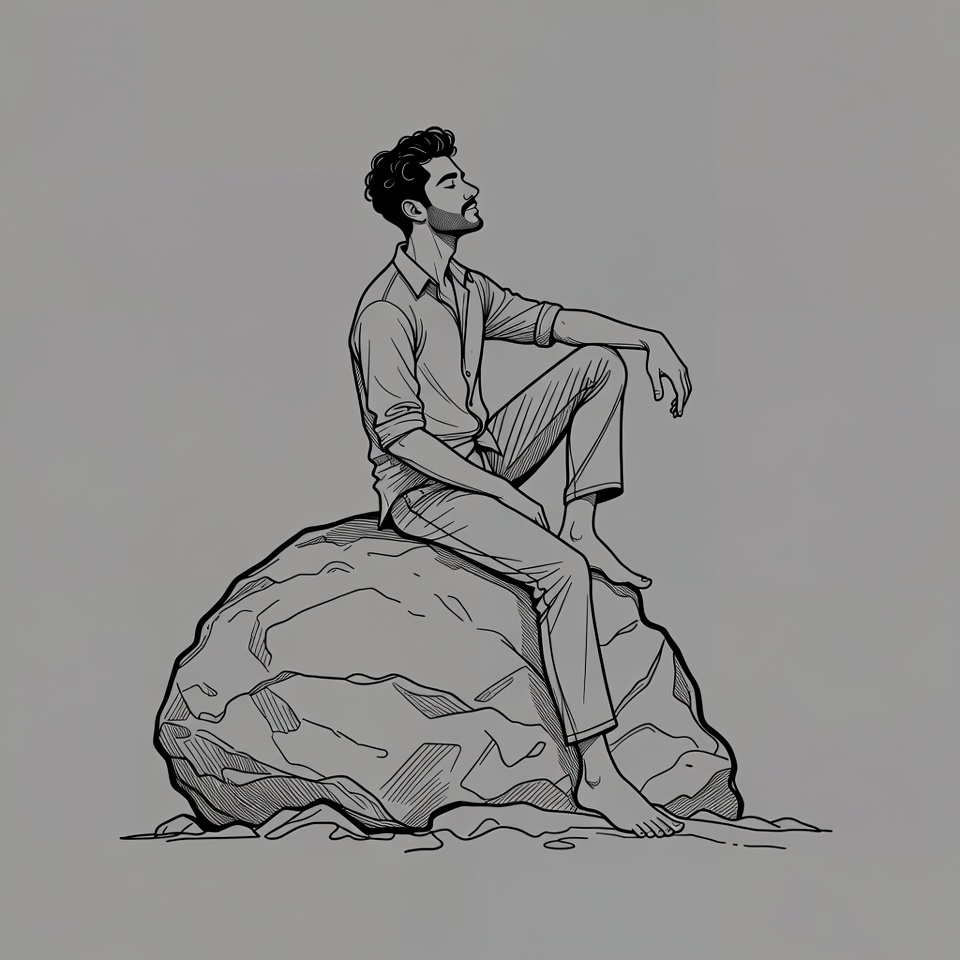A grayscale illustration depicts a young man with curly hair and a beard sitting relaxed on a large rock. He wears an open-collared shirt with rolled sleeves and pants, barefoot with one leg extended. His pose is casual, leaning back with arms resting.