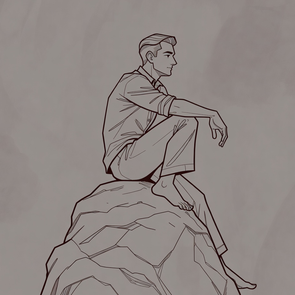 A line art illustration depicts a young man with short hair sitting cross-legged on a large rock. He wears a button-up shirt with rolled sleeves, pants, and is barefoot with one hand resting on his knee. The profile view shows him gazing thoughtfully into the distance against a plain background.
