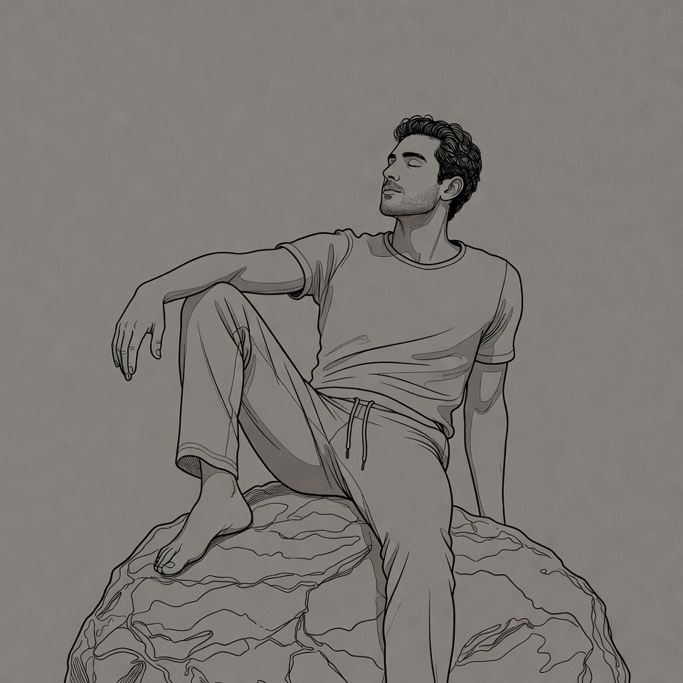 A line art illustration depicts a young man with curly hair sitting relaxed on a large round rock. He wears a short-sleeve t-shirt and loose pants, leaning back with eyes closed and one arm resting behind. His bare feet rest on the textured rock surface against a plain background.