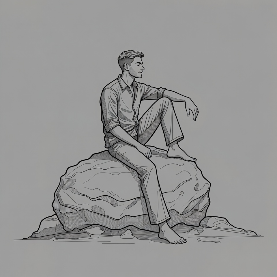 A grayscale illustration depicts a young man with short hair sitting casually on a large rock. He wears a button-up shirt with rolled sleeves and pants, with one arm resting on his raised knee and bare feet. The scene features a simple rocky ground and isolated background.