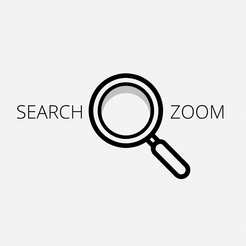 A black line art illustration of a magnifying glass on a white background. The words 'SEARCH' and 'zoom' are positioned around the lens and handle. It features a simple, flat design with a highlighted circular lens.