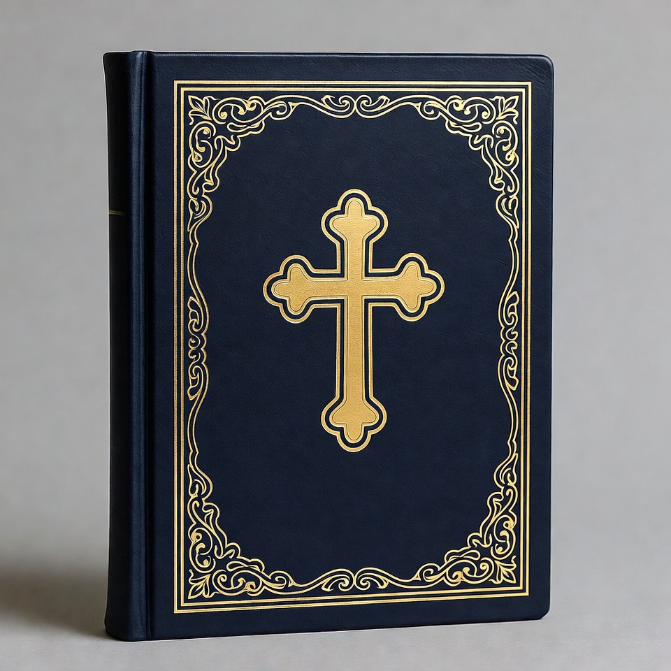 Christian, Latin cross, book cover, faith, filigree, gold cross, gold embossing, isolated background, leather cover, navy blue, ornate border, religious, sacred book, scripture, worship, Bible
