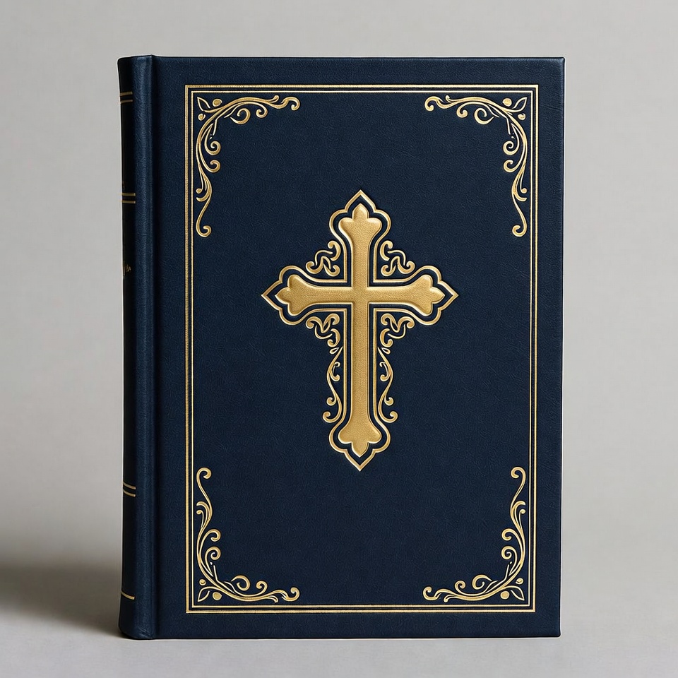 Christian symbol, embossed cross, gold cross, gold filigree, hardcover book, holy Bible, isolated background, navy blue, ornate border, religious book, scripture book, Bible