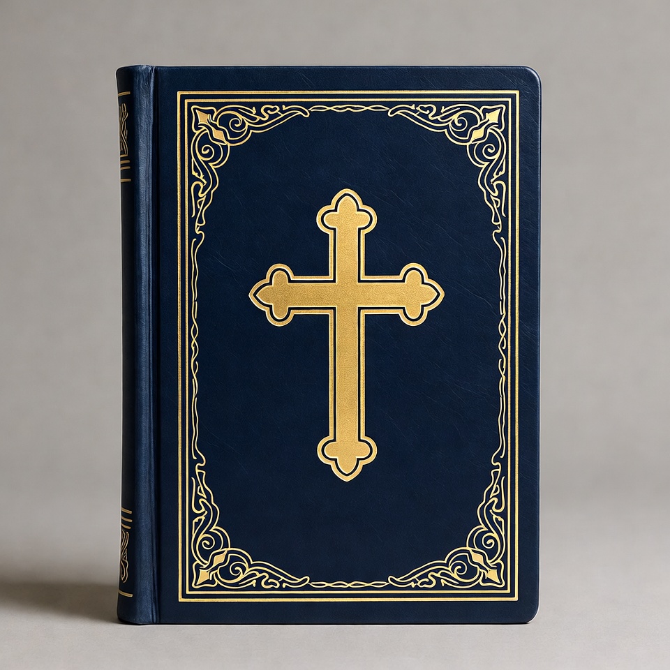 Christian symbol, book cover, embossed cross, gold cross, gold filigree, holy book, isolated background, leather cover, luxury Bible, navy blue, ornate frame, religious book, sacred text, scripture, Bible