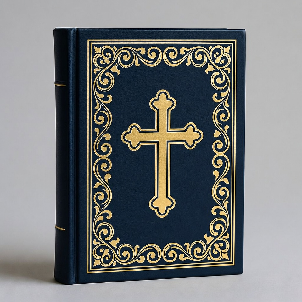 Christian symbol, Christianity, book cover, clipart, gold cross, gold filigree, holy Bible, illustration, isolated background, navy blue, ornate border, religious book, scripture, Bible