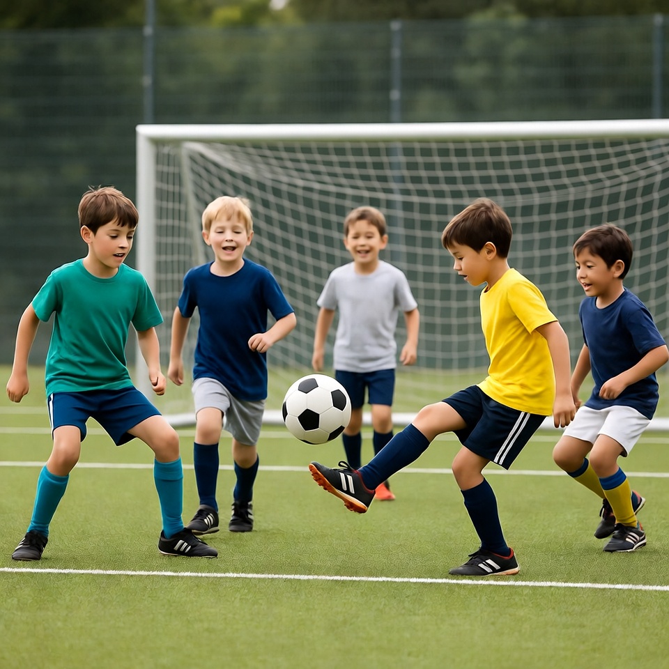 A group of young boys in colorful jerseys and shorts plays soccer on a green field near a goal net. One boy in a yellow jersey kicks a white soccer ball mid-air while others run nearby. They wear athletic shoes and socks in various colors.