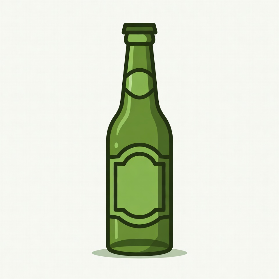 A simple line art illustration of a green glass beer bottle stands upright on a white background. The bottle features a long neck, bulbous body, and a rectangular label with curved edges. It has a subtle drop shadow for a 3D effect.