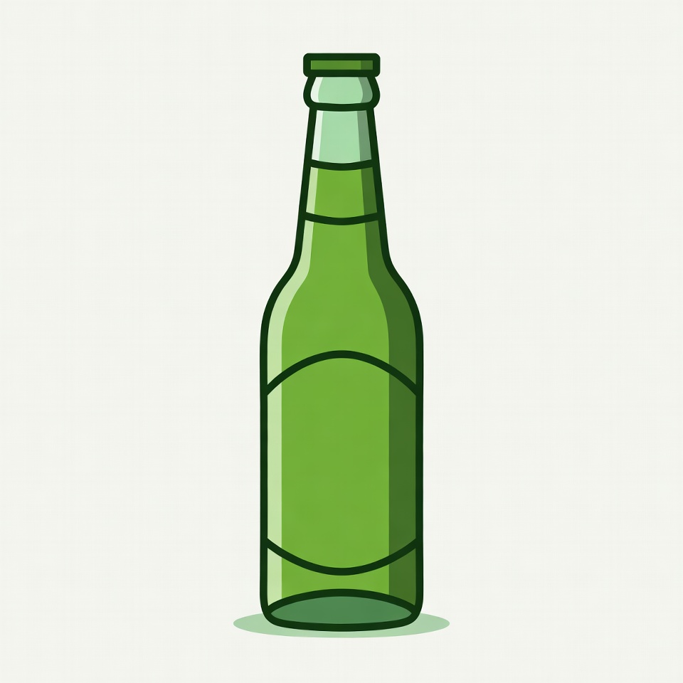 alcohol bottle, beer, beverage, bottle, cap, clipart, drink, glass bottle, green bottle, illustration, isolated background, label, line art, shadow, simple drawing, vector art, beer bottle