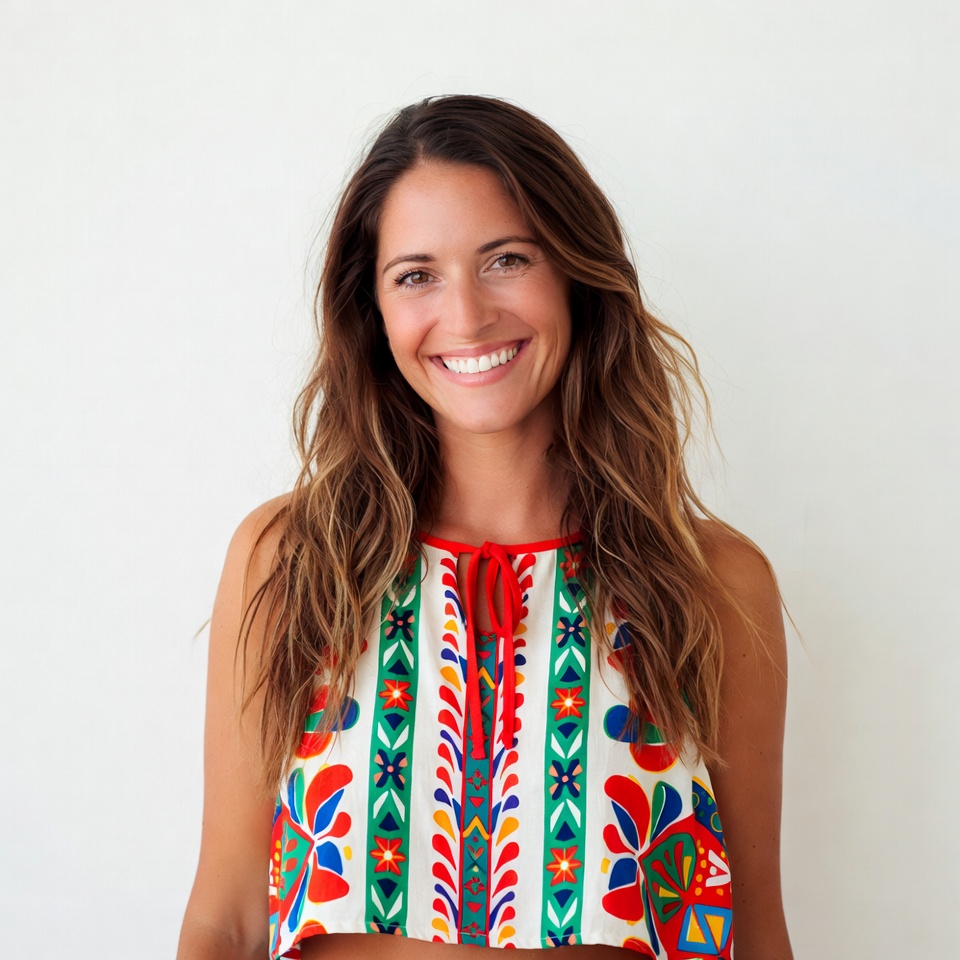 A woman with long wavy brown hair smiles warmly at the camera. She wears a vibrant sleeveless top featuring intricate red, green, white, and multicolored embroidery patterns. She stands against a plain white background.