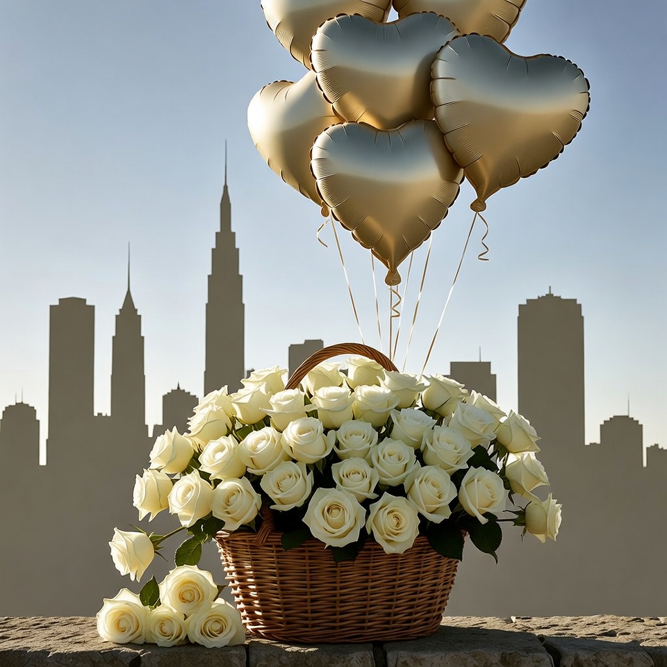 A basket of white roses sits on a stone ledge with a city skyline silhouette in the background. Shiny gold heart-shaped balloons float above the flowers. The scene features tall skyscrapers under a blue sky.