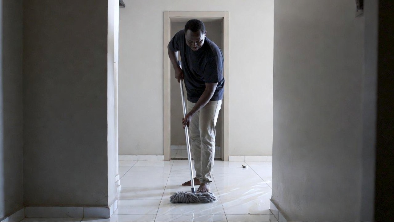 An African man in a dark t-shirt and beige pants mops a tiled floor in a room with white walls and doorways. He bends forward gripping the mop handle firmly while barefoot. The scene features light-colored walls framing the action.