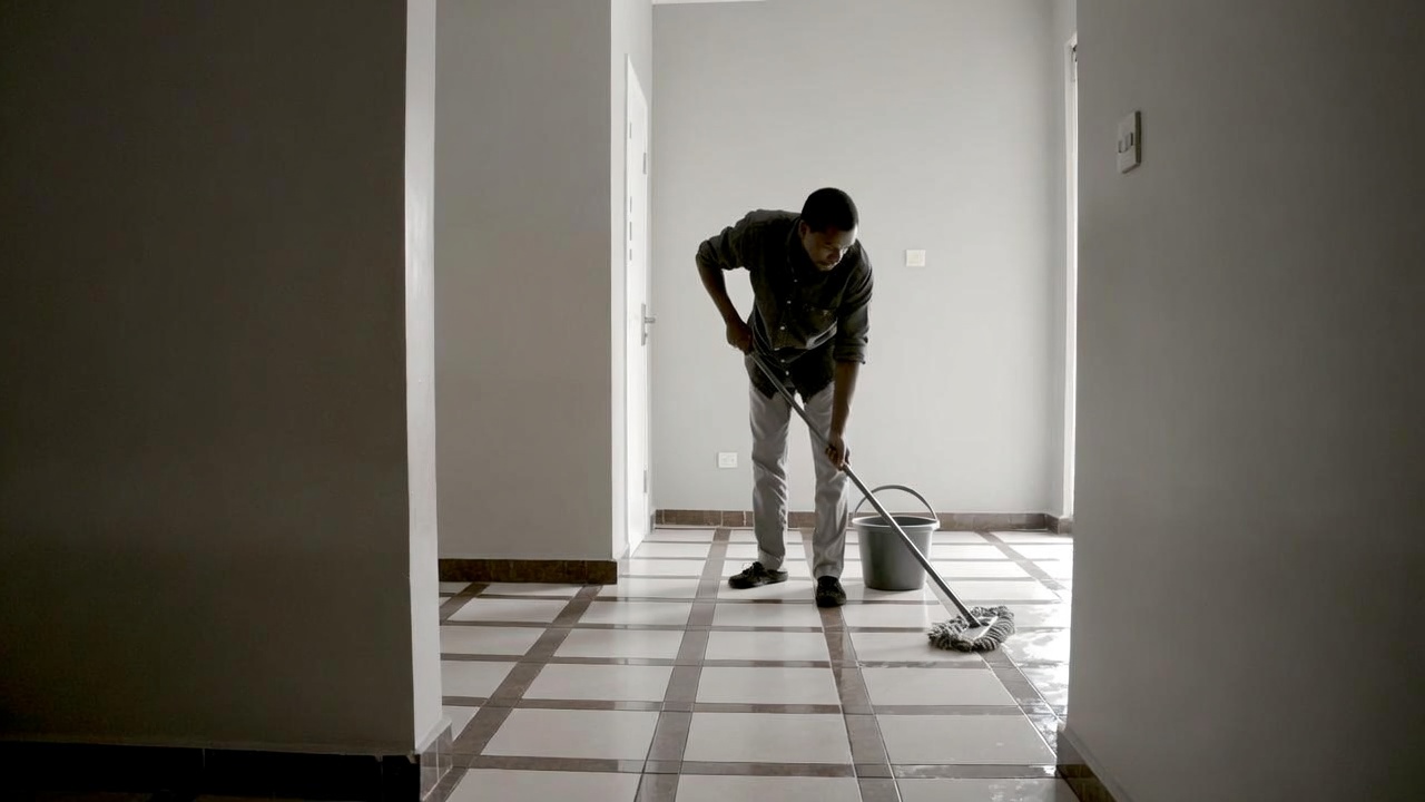 A man with short dark hair is bent over mopping a tiled floor in a brightly lit hallway with white walls and open doors. He wears a gray shirt, light pants, and dark shoes while holding a gray bucket and mop. The scene features checkered tile flooring and soft lighting from doorways.