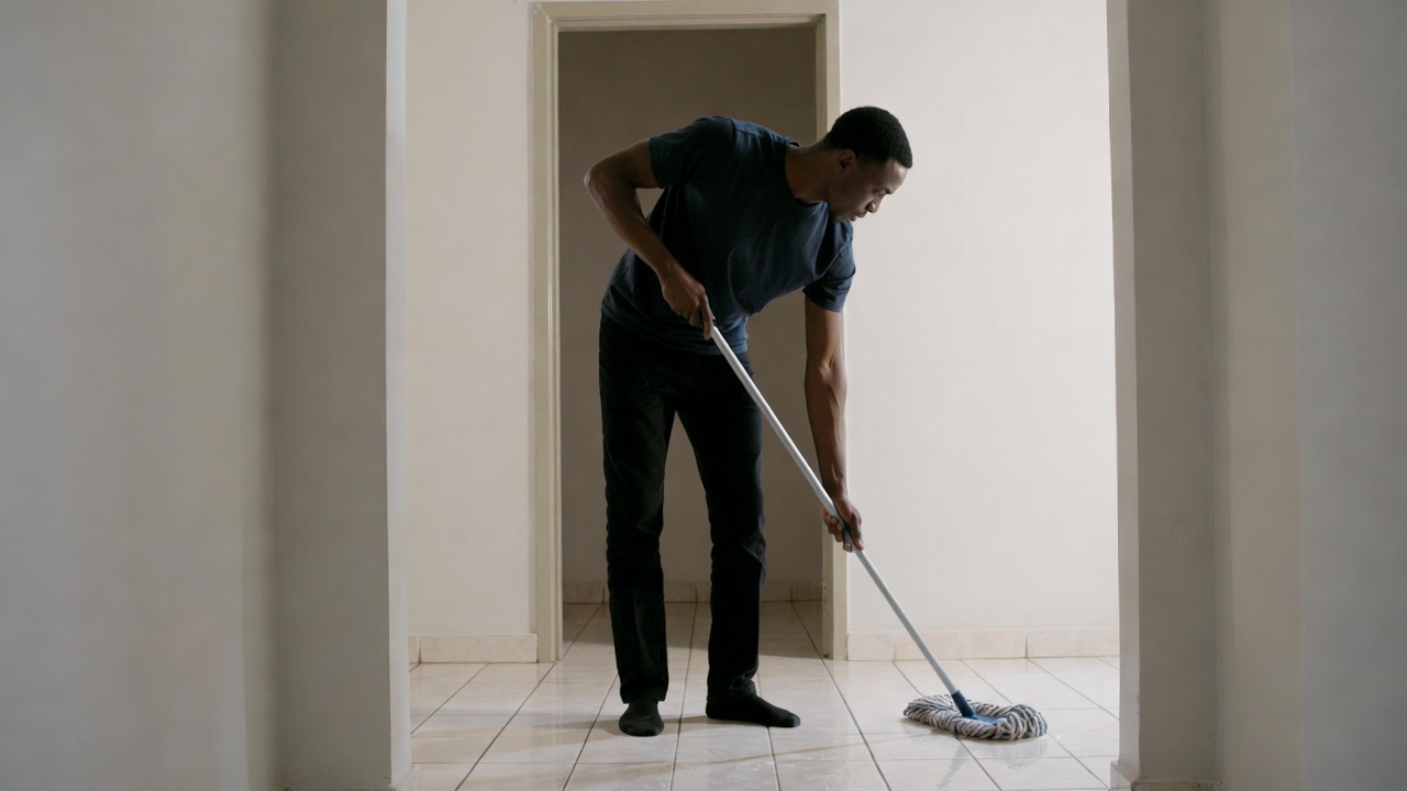 An African-American man in a dark t-shirt and pants mops a tiled floor inside a room. He bends forward while gripping the mop handle firmly. The scene features white walls and an open doorway behind him.