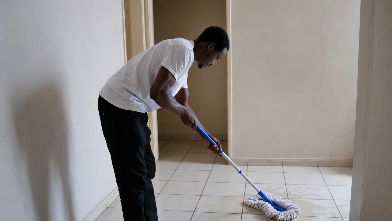 African-American, beige walls, bent over, black pants, blue mop, cleaning, doorway, floor, house cleaning, household chores, indoor, janitor, male, mop, mopping, tiled floor, wet floor, white t-shirt, man