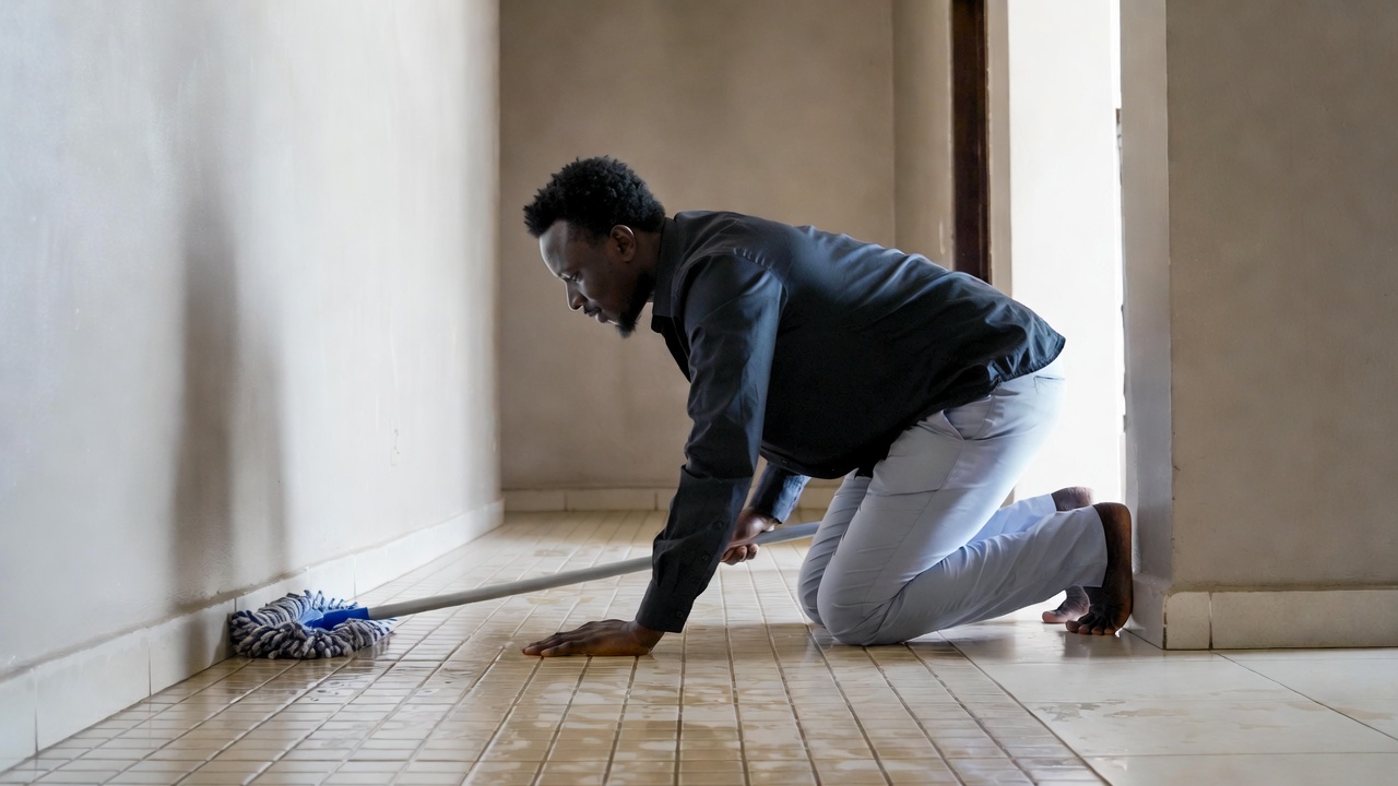 An African-American man kneels on a tiled floor in a hallway, mopping up water with a blue mop. He wears a dark shirt, light pants, and sandals while leaning forward attentively. The walls are light-colored with natural light coming from a doorway.