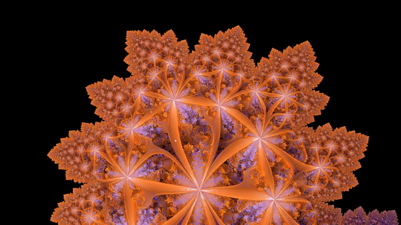 A detailed fractal pattern resembling a leaf with intricate orange and purple hues glows against a black background. The central structure branches out into numerous sparkling, symmetrical lobes. Fine glowing edges create a radiant, fiery appearance.