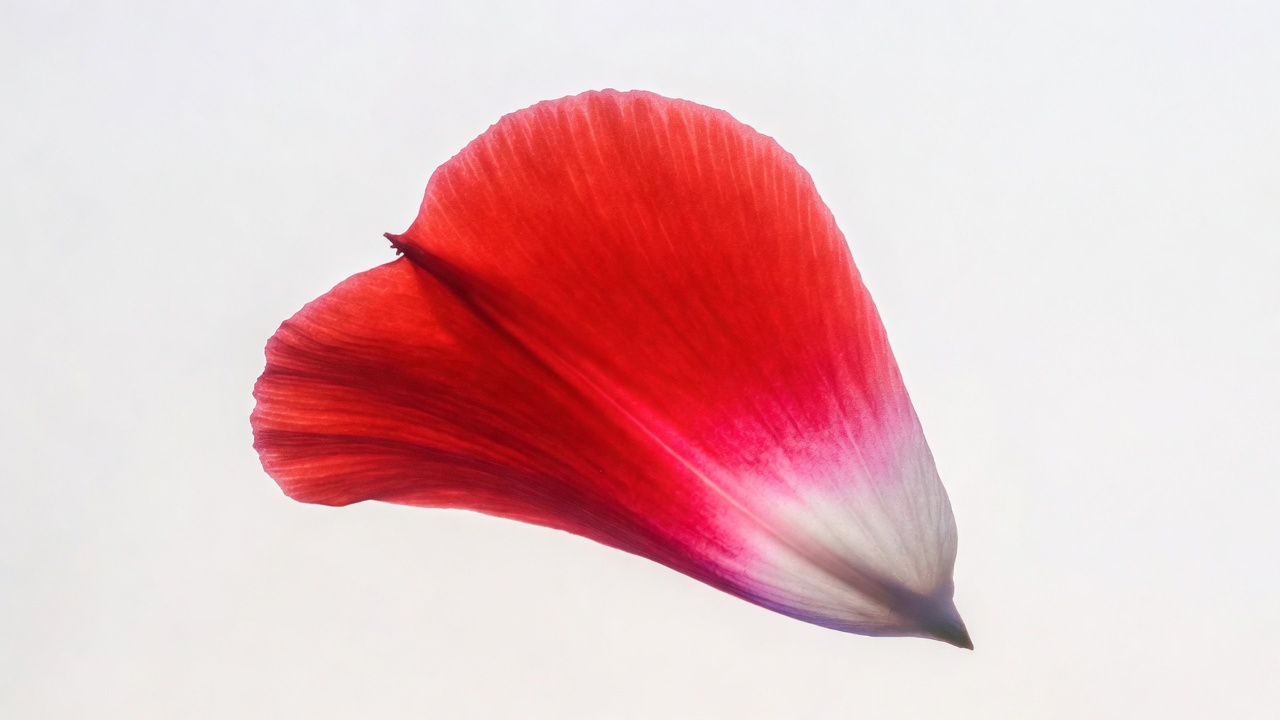 A vibrant red hibiscus petal with white edges is isolated against a plain white background. The petal features a smooth, translucent texture and a pointed tip. It floats gracefully, showcasing its delicate, fan-like shape.