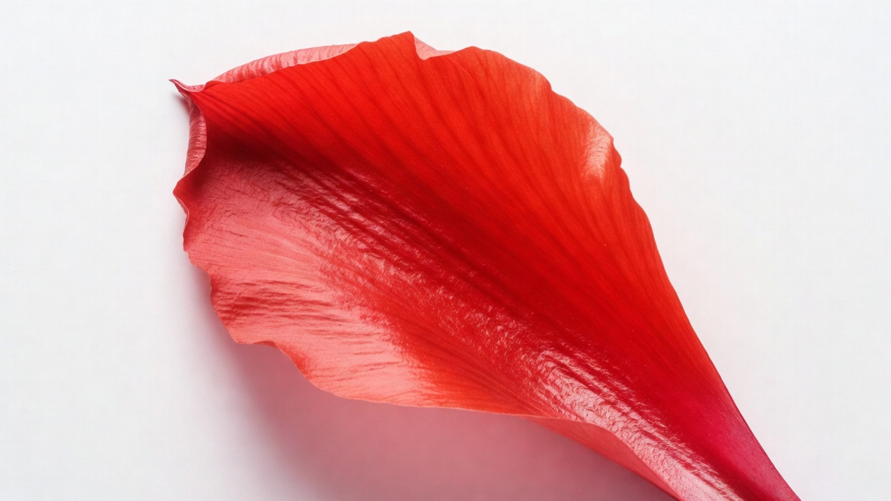 A single vibrant red hibiscus petal lies on a white background. The petal features smooth, glossy texture with ruffled edges and subtle veining. It is photographed in close-up, highlighting its rich crimson color.