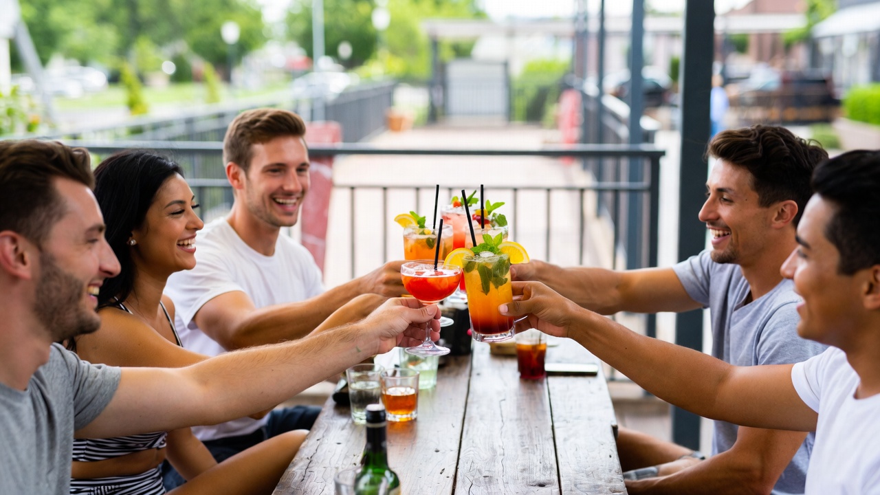 Group toasting cocktails on patio