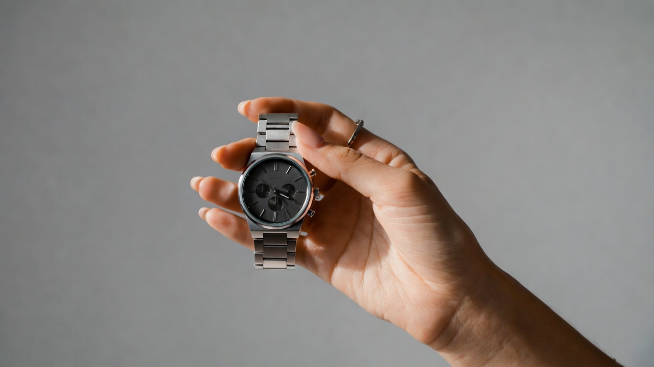 black dial, chronograph, female, fingers, gray background, hand, holding watch, luxury watch, metal bracelet, modern watch, silver watch, timepiece, watch display, wristwatch, woman