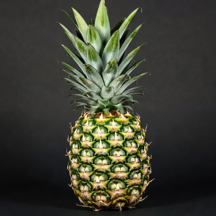 black background, exotic fruit, fresh pineapple, fruit, golden skin, green pineapple, isolated, produce, spiky leaves, textured fruit, tropical fruit, pineapple
