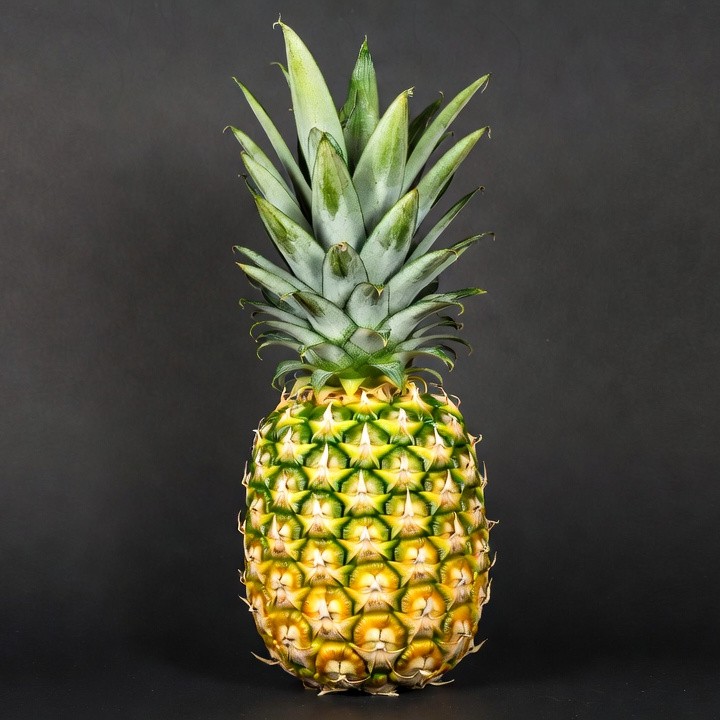 black background, fresh pineapple, fruit texture, green leaves, isolated, juicy pineapple, pineapple fruit, product photo, ripe pineapple, spiky crown, tropical fruit, whole pineapple, yellow fruit, pineapple