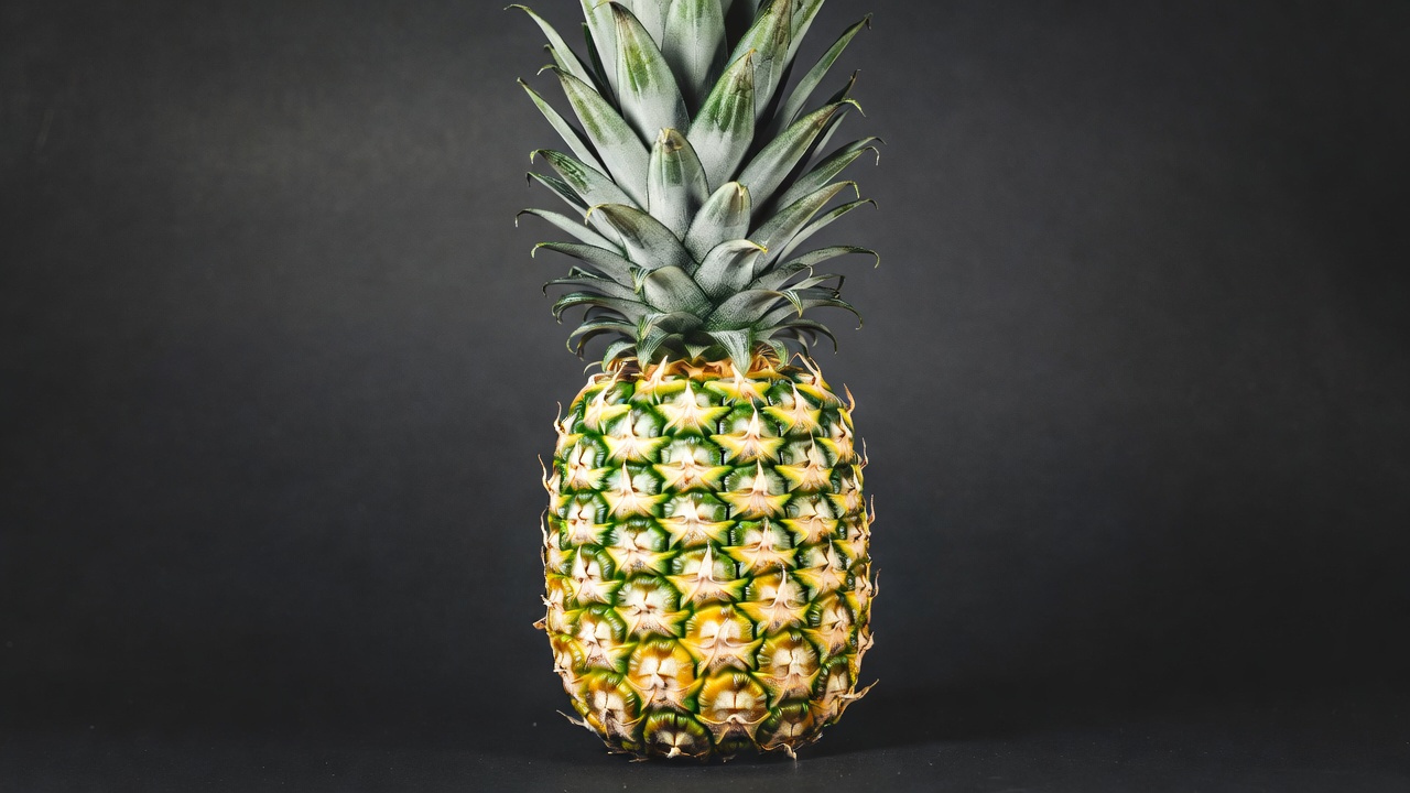 black background, exotic fruit, fresh pineapple, fruit texture, green leaves, isolated pineapple, juicy pineapple, pineapple crown, pineapple fruit, ripe pineapple, spiky leaves, tropical fruit, whole pineapple, yellow fruit, pineapple