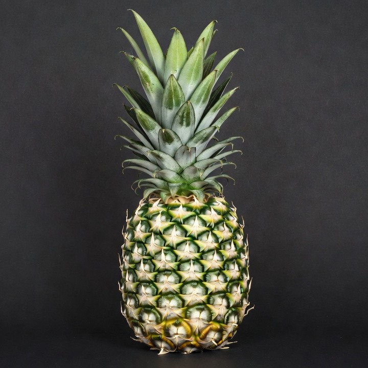 black background, exotic fruit, fresh pineapple, fruit, green crown, green pineapple, isolated, juicy pineapple, pineapple crown, pineapple fruit, ripe pineapple, spiky leaves, textured skin, tropical fruit, yellow green fruit, pineapple