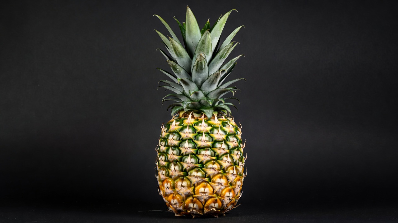 black background, exotic fruit, fresh pineapple, fruit, fruit isolated, green crown, isolated, juicy fruit, pineapple fruit, ripe pineapple, spiky leaves, tropical fruit, whole pineapple, yellow scales, pineapple