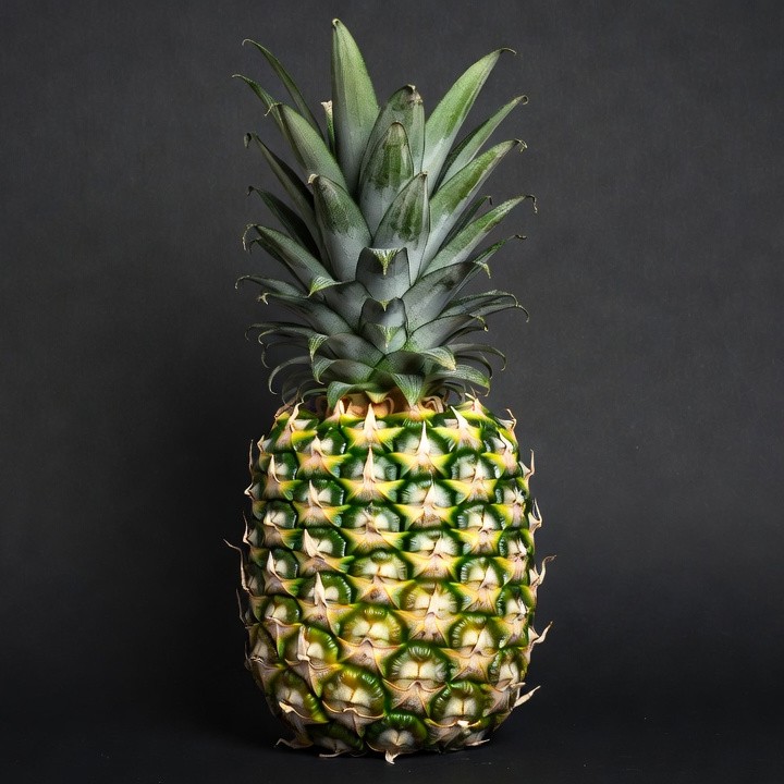 black background, fresh pineapple, fruit photography, fruit texture, green crown, isolated pineapple, pineapple fruit, ripe pineapple, spiky leaves, tropical fruit, whole pineapple, yellow fruit, pineapple